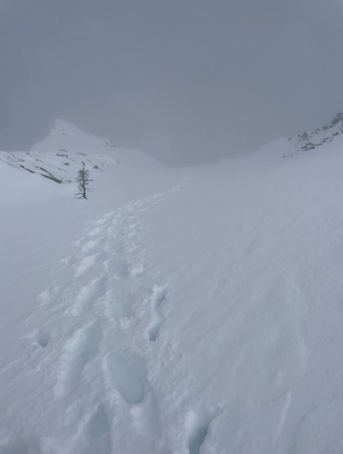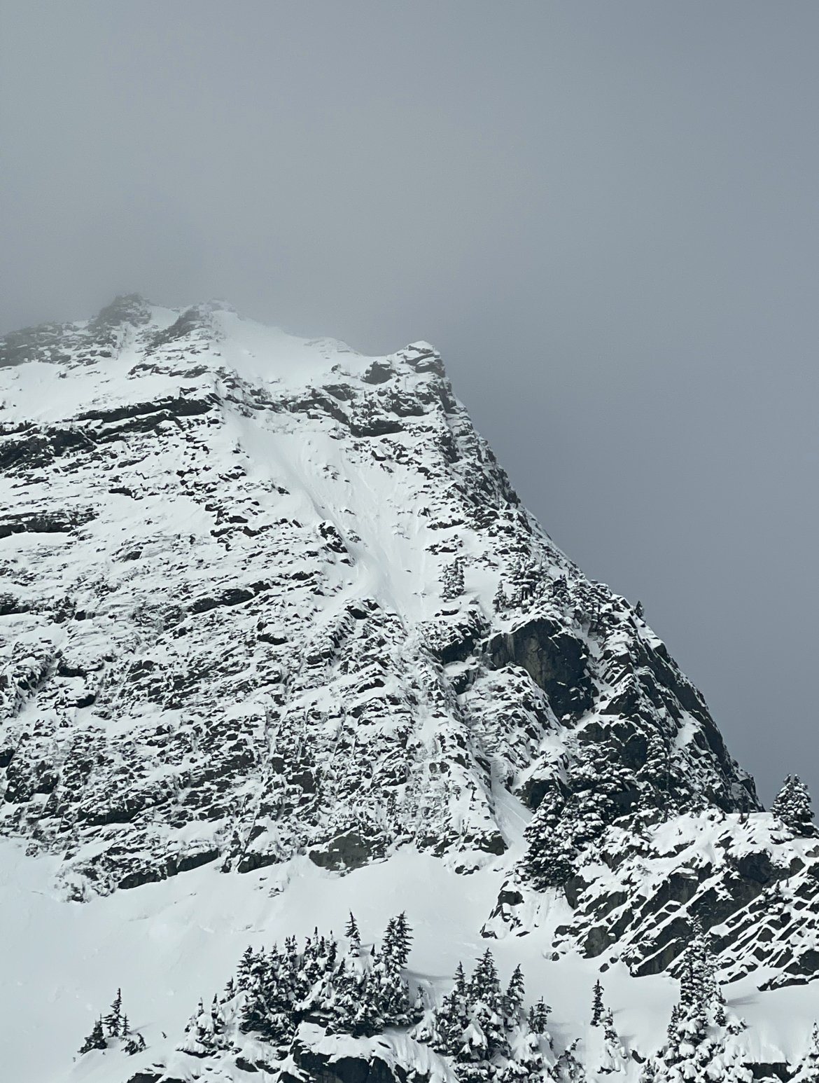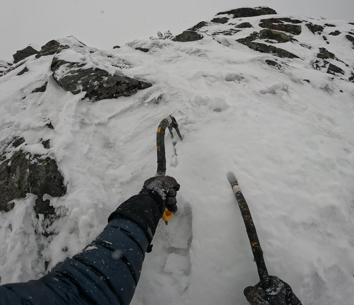 Disclaimer: if you're looking for beta, you'll probably be disappointed by this TR. If youre looking for an emo introspection on soloing, then perhaps you’ll be amused… I awoke without an alarm on Tuesday morning. I stumbled around and gathered my things. Two skinny 30m cords, ice tools, crampons, one ice screw, 2 carabiners, some snacks.. I loaded my pack and headed up to the pass around 8am. I left from a nearly vacant lot at 8:40; not exactly an alpine start. But with freezing levels down to 500ft and clouds in the forecast, I wasn’t too worried about timing. I skinned up the thinnest approach to Source Lake I have ever seen in February, my skis sliding out from under more than I would’ve liked. My normal skins for these skis are having glue issues, so I used 77mm skins on my 95mm skis, not ideal.. As I skinned, I thought back to the last time I attempted this route, which was 9 years prior with my college girlfriend. We drove down from Bellingham and accidentally climbed a full pitch up Bryant Peak before realizing that we were climbing the wrong mountain. Hopefully today will go a bit better, I thought to myself. As I skinned through the valley, the morning fog lay like a wet blanket. Cold, wet, quiet. I skinned up from Source Lake; there was about an inch of snow in the skinner, which made the skinning a bit nicer than the ice down low. I caught a glimpse of Chair through the trees as I crested above the fog. Dang it. Looks like no ice on the upper pitch. Oh well, maybe it wasnt meant to be. I can still take a look at the North Face, or maybe climb the lower pitches of the NE Butt, then bail. I passed a few other skiers. I was actually enjoying being alone with my thoughts, so I moved quickly, eager to get back to some silence. I finally got up into the sun and was fully free of the fog. I felt the humidity drop and my sweat start to dry, one of the best feelings. The feeling was short-lived. I booted up the thumb tack to the ridge where clouds had again blown in and brought light snow. Above the fog... View of the route. I meandered along the ridge and finally got a view of the North Face, no good, no ice, just snow on rock. Not today. I ended up at the base of the NE Buttress of Chair without even really stopping to consider if and why. I looked up, and the rocks above had a smear of ice that looked fun to climb. As I transitioned from skinning to climbing, I briefly pondered my options and how I was feeling. Soloing requires confidence. But too much confidence will get anyone into trouble. It's a delicate balancing act. Today, I had the confidence. I started up. The ice was thin. Ranging from a quarter inch to 2 inches in “fat” spots. The movement of climbing sub-vertical ice and rock is addictive. Delicate taps with the tools, finding edges for the crampon mono points, ice and rock, perfectly mixed. Nothing feels better than flowing through that terrain. Soon enough, I had “flowed” my way into a pickle. I looked up and realized I had blown past a ramp to the left I should have taken. Above was vertical rock that I had no business touching, so I awkwardly scraped my way down a bit and transitioned left over the ridge. I was not psyched about this little blunder. The downclimb had some scary moves that I did not enjoy. I contemplated bailing. Confidence gone. I knew the upper pitch wasn't in any way, what's the point? This is all so contrived… The thin climbing right off the bat, not much ice but it was good. I continued moving upward through ice and rock and got back into the flow on this slightly easier terrain. The ice was mostly an eggshell over powder on rock. The movement was a 50/50 split between scraping tools or ‘pons looking for a positive edge out of sight beneath the snow, or gentle sticks in snice. I topped out the lower pitch feeling good. I looked up at the upper “ice” pitch with no ice, and I looked at the trees to my right that I could rap down and be done. Oh well, I’ll just keep going up. I’m curious if this middle snow slope is skiable anyway. Eggshell ice over rock. Looking up at the "ice" pitch on the right and the ramp I took (but would not recommend) on the left. I booted up the snow slope, moving quickly. Only a few inches of boot pen made for efficient movement. As I approached the upper step, I considered taking the plum line that had a few ice smears, or traversing out left to what appeared to be lower-angle snow and rock. At this point, I felt like I was way off the deck and had already made one mistake, so I took what I perceived to be the easy option to the left. I climbed out of the steep snow into the steeper rock and quickly regretted my decision. No ice, very few positive edges, not ideal. I scraped my way up it, crampons skittering on smooth rock; it felt a bit harrowing. There was one lone tree at the top of these rocks, and when I finally grabbed a branch, I breathed a sigh of relief. I pulled myself up over the tree and booted to the top, relieved to be done with the climb. I wandered around the top, went to the true summit, and looked for my descent. Nothing looked like the photos I had looked at. Eventually, I found the correct gully based on a dead tree at the top, which I recognized from a photo. The correct gully was a little bit back down the climbing route from the summit(s). The descent gully was nearly dry, and I face-in down-climbed down nearly the whole thing. It was slow and tedious, and a few spots felt about as thoughtful as the route up, except there were a few smears of solid ice yielding good sticks in this gully, unlike most of the route up. I got down to the rap station and joined my 2 30m cords for a 30m rap. I finished the rap and thought that what I had just rapped seemed a lot easier to down climb than what I had down climbed to get to the rap anchor… Up the final slope. Looking down the descent gully. A slow transition at the bottom of the descent gully ensued. Coil ropes, harness off, cr