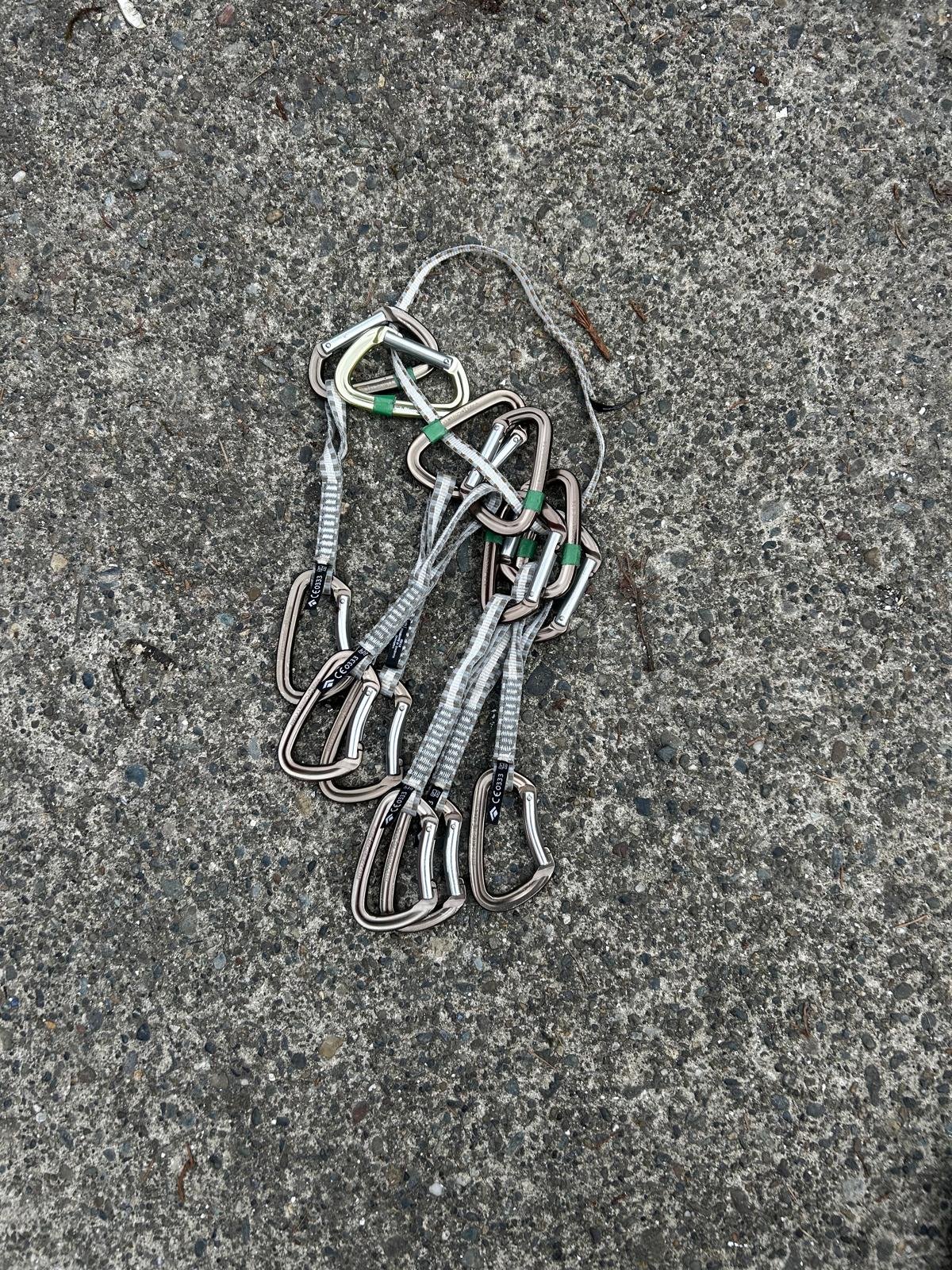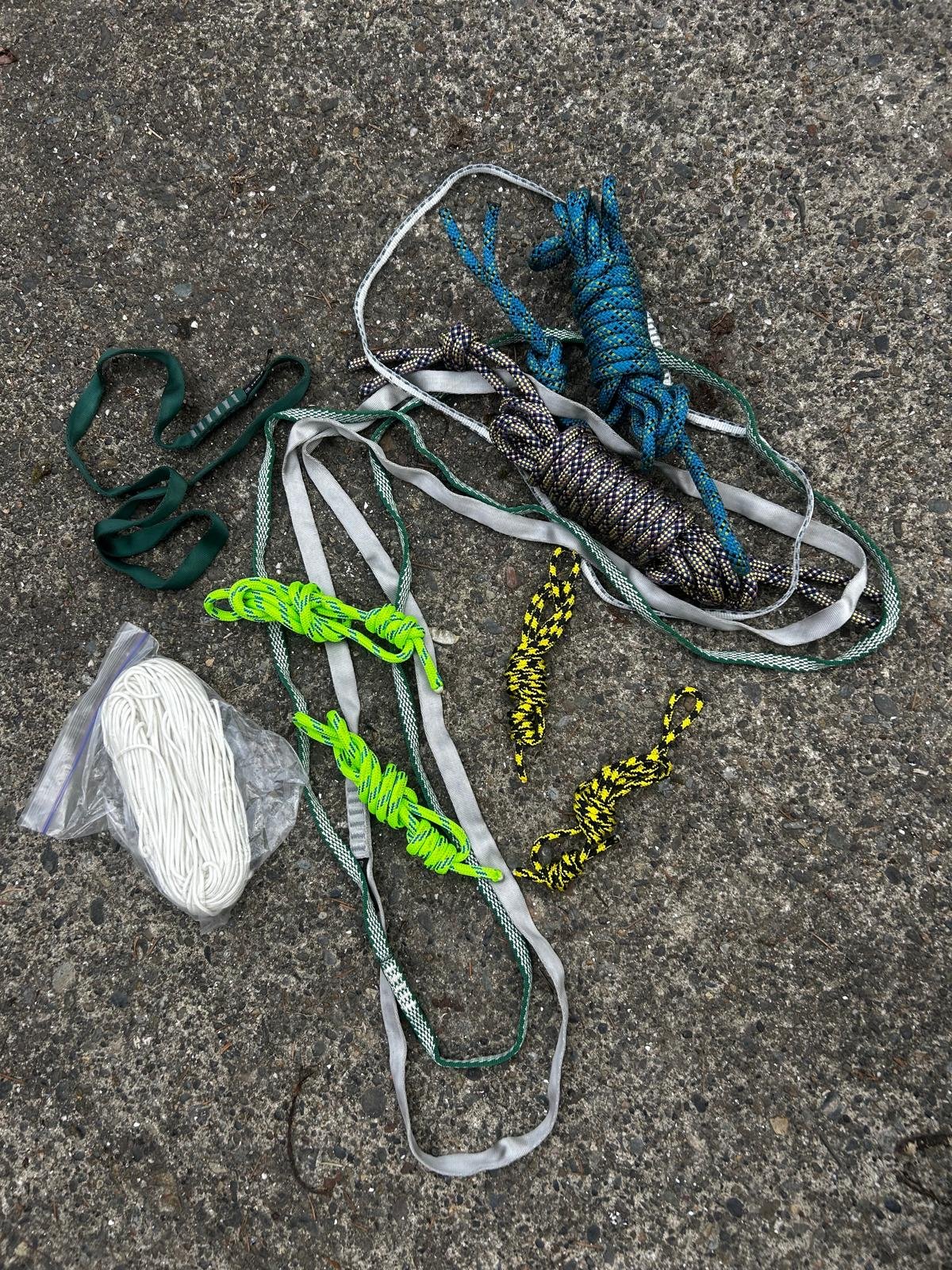 1. Various cordalette, and some slings. 2. A sling with various non-locking biners. 3. Nut tool with a retention bungie type clip. 4. A couple quickdraws with a bunch of locking biners. 5. 6 quickdraws on a sling 6. Either 6 more quickdraws on a sling, or a second picture of #5. 7. Some webbing suasages. 8. a set of tricams, with doubles in black and blue. The pricing I can't really help you with. It's used climbing gear. Most or all of it looks to be in great condition. The cordalette and webbing isn't worth much, not is the nut tool. You could look up the brankd of the gear and do a quick google search to get comps. All of this stuff it worth something to people building or filling out a rack. Not a ton of money, but there is definite stuff people would want. The locking biners and the quickdraw set stand out to me. tricams have their fans, but they aren't for everyone. -
