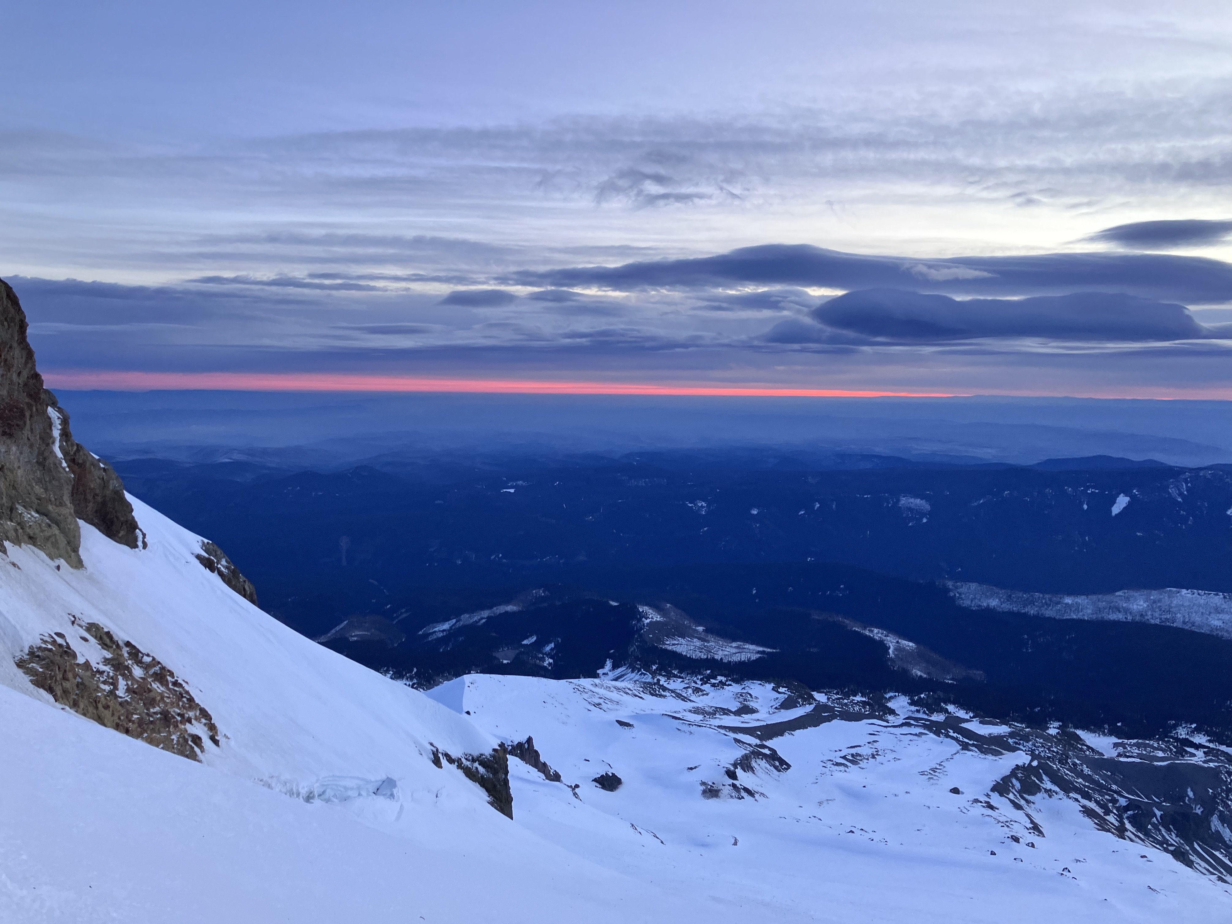 Trip: Black Spider - Wy'east - Arachnophobia Trip Date: 01/31/2026 Trip Report: Climbed Arachnophobia the other day. Good ice, a little brittle first thing. Snow is very icy which makes for some tiring front pointing. Not as sun baked as it might appear. Five long pitches does it. L side of schrund went easily. Thanks to G for being a great partner, and Kyle and Matt for going up the route first so I didn't need to leave the family just to have a look-see. Pictures... Luckily sunrise had some cloud cover. Starting up the ice-looking bits, after some snow-looking bits that were still icy Snow-looking icy bits on P2 Starting up P2 Leading P3 Looking down P3 Coming up to the final belay at a rock anchor Descending S Side Hoping we get some snow this winter. But while we wait the sticks are quite good. If you need more beta, please feel free to DM me. -Sam Gear Notes: Single rock rack (small cams and nuts useful, nothing bigger than 0.5), pins, 10 screws Approach Notes: S Side and traverse over White River and around.
