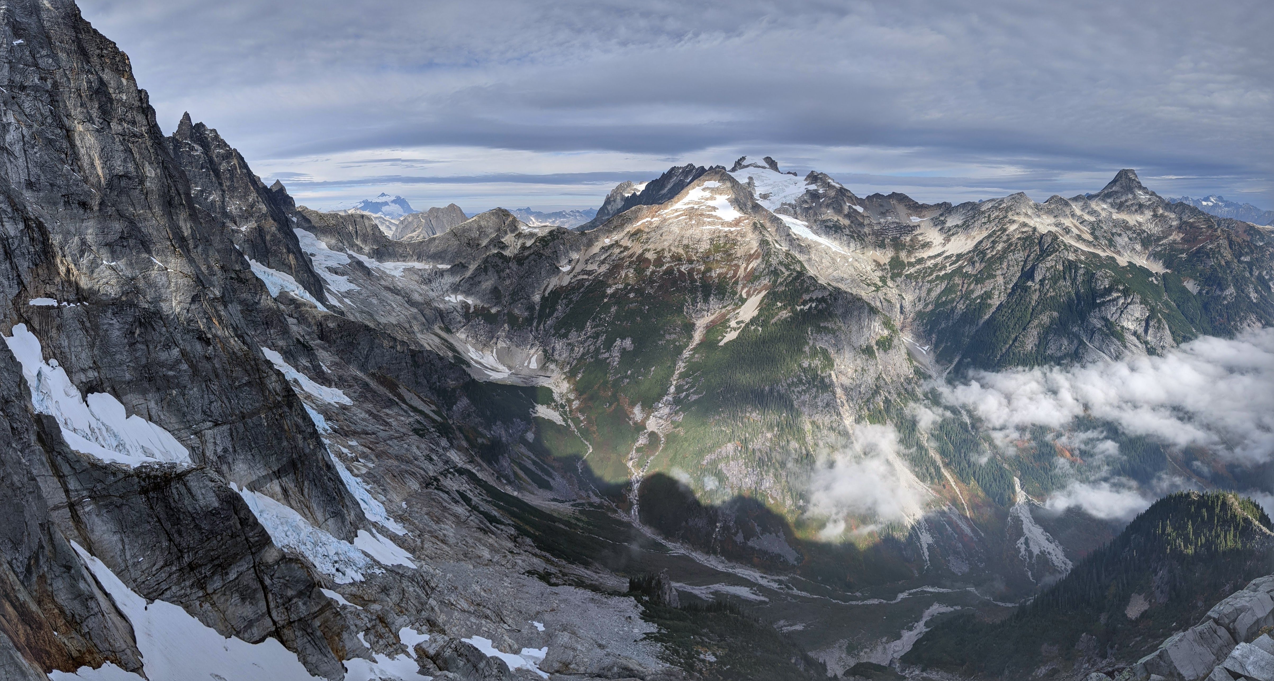 Thanks for the kind words. And yeah, it was way more casual than I expected. I figured there was a decent chance we'd climb through the night. But, nothing went wrong (mostly, we didn't blank out and have to pendulum). Also, while I expected decent rock compared to the Pickets reputation, the rock was vastly better than I'd dared hope. Like, legitimately good. I could list a lot of local granite routes with similar or worse rock. I mean, this is obviously an extremely serious route and environment with some loose, wet, and vegetated rock, and a slight deviation from our path could yield a very different experience. Bailing would be spectacularly unpleasant and expensive. But it's also a much more pleasant and, yeah, casual route than I would have ever expected. And right, re: snow on the approach: the 76/86/08 parties encountered substantial difficulties with glaciers/ice blocks. I also know someone that recently tried to traverse under the McMillan cirque North faces from Stettatle Ridge in late spring, and was turned around by some weird messed up crevasse situation with what seems to be a seasonal glacier (following roughly the Volken ski approach). But, I think they were lower than you'd be to approach the buttress, so maybe it's not a big problem these days. These glacial remnants seem to always be gone by Sept, and we just had one short section under some mildly threatening blocks where we felt the need to scoot (similar to approaching Triumph NE ridge). Here's some more detail: Approach: from the Terror basin bivy, walk/scramble up slabs diagonally toward base of Little Mac. There are bivy sites with year-round water around 6400-6700ft below/S of Little Mac. Find a narrow ledge below Little Mac to access the NE trending ridge toward Elephant Butte. Scramble NE along this ridge for 10-20 minutes, finding a slung boulder about 50m before the first low point/col. Make four 45-55m rappels starting from the boulder, at first in the corner. After the second rappel, walk 20m skiers right on a ledge to find another slung boulder. The fourth rappel finishes over a rotten, red overhang. From the base of the rappels, walk/scramble to the base of the buttress, continuing around to the right/W side, and scramble up and back left toward the crest. In late season (Sept) there will likely be no need to cross snow (although plentiful flowing water), with one area below broken up ice blocks where you’ll want to scoot with some urgency. Early season, though, there may be a seasonal glacier with substantial crevassing that could hinder access (a la Slesse). Route: When the buttress steepens to fifth class, simul climb for 200-300m until a ledge where it steepens further and the pitched climbing begins. Looking up, you will see the buttress crest on your left, then to its right a right-facing corner (2008 route, we think, we climbed this), a rotten looking roof, and further right another weakness/corner (1986 route, I think). Belayed pitches range from perhaps 5.8 to 5.10-, and it’s hard to give per-pitch grades, but p3 is the mental and physical crux. p1 (50m): Begin in the corner directly below the rotten roof (to the right of the upper, left-hand R-facing corner that you're aiming for). When the cracks become wet and filled with moss, traverse a couple of meters right to a cleaner corner, and belay just below the rotten roof. Note: this is what we did, but it may be better to take the next corner left, which aims you straight toward the left end of the chossy looking roof, and thus avoid the traversing pitching. p2 (20-30m): Traverse horizontally left, out from under the chossy roof, passing below another crackless roof/overlap, aiming for the solid/clean rock near the crest. Belay near two rusty pins. p3 (45m): From the old pin anchor, go up and left into the solid corner with clean cracks, passing an ominous looking fridge-sized block that, once you reach it, sounds solid enough to (gingerly) climb on. Continue up placing gear behind surprisingly solid flakes to pass a small roof, emerging on a slab that provides entry to the large R-facing corner at which you've been aiming. Climb the slab up and into the corner on solid rock, but at times little gear, until you can step right onto a pedestal belay. p4 (50m): Climb up from the pedestal toward the left side of the mossy, chossy-looking roof; but traverse right just under the roof on solid, clean face holds, using the roof only at its solid right edge. Emerge onto a large grassy ledge, climb up solid blocks/boulders into a steep, splitter thin hand/finger crack leading to another, larger but sloping grassy ledge. Continue up the grass/heather slightly rightwards to belay at the base of a corner. p5 (45m): Go up and right on the face R of the corner. There are numerous options but they all deposit you on a small sloping ledge where the face converges below the main corner. p6 (50m): Climb up cracks and grooves on the right wall of the corner, aiming for the right side of an overlap below a larger roof. After placing gear in the roof, step left above the overlap and continue up to belay in a small sloping alcove. p7 (50m): Climb rightwards out of the alcove, passing a small roof on its right to emerge onto a rightward-sloping ledge. Walking right will lead to bivy sites; but if not bivying, continue straight up into a steeper, shallow corner with several cruxes (one just off the ledge), belay when you find a good stance. p8 (50m): Climb straight up in a slightly easier corner/groove, stopping to belay when the angle eases. You are now in the schist band: rock quality deteriorates. Simul climb for 50-60m, straight up a broad depression, exiting on steeper, splitter cracks slightly rightwards leading to lower angle slopes facing more westward. We continued simuling, aiming for a steeper ramp 30-50m right of the crest, which had a fixed pin, but was the only bad/scary/chossy pitch of the route. Not recommended. Instead, after exiting the steep crac