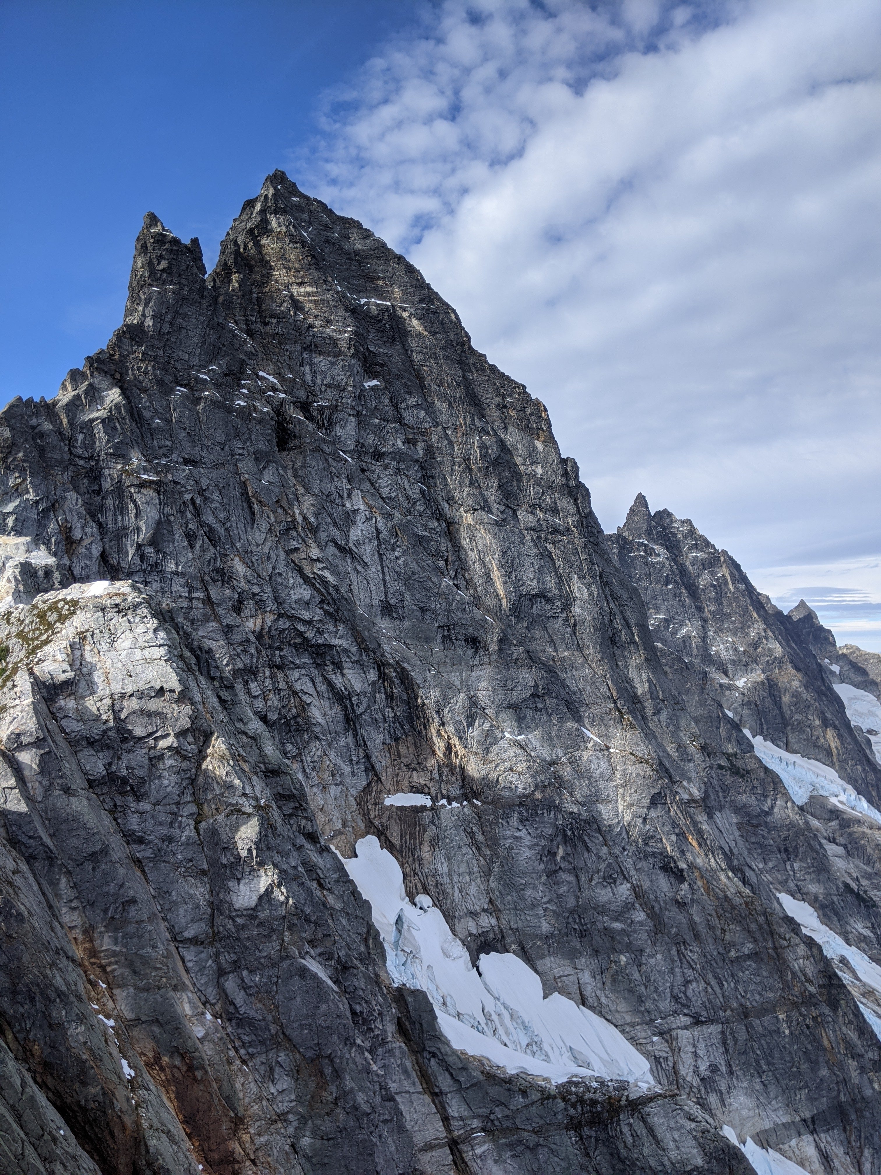 Trip: East McMillan Spire - North Buttress Trip Date: 09/24/2025 Trip Report: As Blake seems to speculate in the back of Cascades Rock, this is a legitimately high quality route. While the rock is of course worse than Index or Supercave, it is better than the E ridge of Inspiration or Stoddard Buttress on Terror (and much better than Megalodon). It's also less vegetated than the E face of Triumph or Sloan SW face. There was only one pitch we wouldn't recommend (up high in the schist band), but it can and should be avoided. The steep middle section is characterized by thin parallel cracks, highly textured ripples, and shady climbing with a shocking lack of lichen. When you emerge onto the slightly more West facing schist band for the last few hundred meters, lichen becomes tiresome as the angle eases and rock deteriorates. There are absolutely a couple of serious runouts, but they occur on clean, solid rock. From camp on a small heather patch a few minutes below Little Mac, we approached via a ledge just below Little Mac that accesses the NW trending ridge toward Elephant Butte. We made four rappels beginning at at an old station I had found during a recon trip in October 2020. This seems likely to be the rappel used by the 1986 party, maybe also the 1976 party, and I think @rat has also mentioned climbing the buttress, so perhaps used it as well. The 2008 party (AAJ, NWMJ) approached via Stetattle ridge. After four 45-55m rappels, we walked and scrambled easily to the base of the buttress. We simulclimbed 200-300m on the lower buttress, then belayed eight ~45-50m pitches (5.8 to 5.10-), then simulclimbed (interrupted by one belayed pitch, which we would recommend avoiding) to the summit. For the central, steep section we wanted to climb near but right of the buttress crest, which except for pitch 2 (a horizontal leftward traverse) yielded a logical path almost directly upward. Looking upwards from low on the buttress, two corners right of the crest (separated by a chossy roof) seem to provide the obvious options into the steeper middle section. We aimed for the left corner (which we presumed was the 2008 route), and thought the right corner was probably the 1986 route. We encountered many pieces of fixed gear throughout the route (mostly knifeblades, with a few nuts, a hex, and a rigid stem friend). Since the 2008 party rappelled the face (!!!), presumably close to their line of ascent, we think we followed large portions of their route (Come Over to the Dark Side). That said, I haven't really managed to match the route lines in either the NWMJ or AAJ to our experience (at least at the resolution I can manage to download). From the summit, we downclimbed SW to the col with West McMillan, then continued downclimbing S in the gully for a few minutes. When the gully's left wall flattened, we slung a boulder and made four 45-55m rappels to reach low angle slopes and walked back to camp, arriving about 15 hours after leaving that morning. West McMillan, Inspiration, The Pyramid, Degenhardt, and Terror from high on the route: From left to right: E McMillan, W McMillan, Inspiration, The Pyramid, and Degenhardt. The route goes just right of the sun/shade line on the leftmost peak. The approach rappels start down a relatively solid corner just right of the low point on the left). Photo by Steph Abegg: First rappel into McMillan Creek cirque: Racking up before the first simul block: Marlin starting up the first simul block: Marlin at the top of pitch 1: Looking back partway across the pitch 2 traverse. There was a fixed two-pin anchor at the end of this traverse that may be that in the 2008 NWMJ "Erik starts the crux" photo: Looking down partway up pitch 3. This section had some blocks and flakes that looked ominous from below, but sounded and felt solid on closer inspection: The upper part of pitch 3. This was probably the most runout section of the route: Looking down the start of pitch 4: Marlin at the top of pitch 4: Marlin starting up pitch 5: Marlin starting up pitch 6: And navigating the roof on pitch 6: Starting pitch 7: And pitch 8, which should have been the last belayed pitch: Simuling in the schist band: Marlin leading the very-not-recommended lichen covered, loose pitch in the schist band. Go right before here, toward the E Mac col, to keep it scrambly. There was a fixed pin near his feet here, so we weren't the first to get suckered into it: Belaying on the summit. The buttress crest in this section is stacked, lichenous blocks that seem to overhang the impressively steep East face. You want nothing to do with the crest here: Setting up the first rappel out of the E Mac-W Mac gully: Impressive ambience the next morning, looking toward Azure lake from camp: Hiking out, looking toward Triumph: And a friend from the start of the schist band. It was still solidly placed and easily removed after, probably, 17 years (although could use some lube): Gear Notes: Modern gear made a huge difference on this route, especially microcams (compare the 2008 party's rack in the NWMJ pictures), microtrax simuling, and fix-and-following. We took a 50m lead and 65m tag line (we didn't haul), ~5 kbs/lost arrows, at least triples to fingers with offset aluminum and brass nuts, doubles to #1, single #2 and #3, and four microtraxions. Our smallest cams (purple C3 and green/#0 Z4) were used in several critical placements. Approach Notes: Goodell Creek to Terror Basin, then up slabs toward Little Mac.