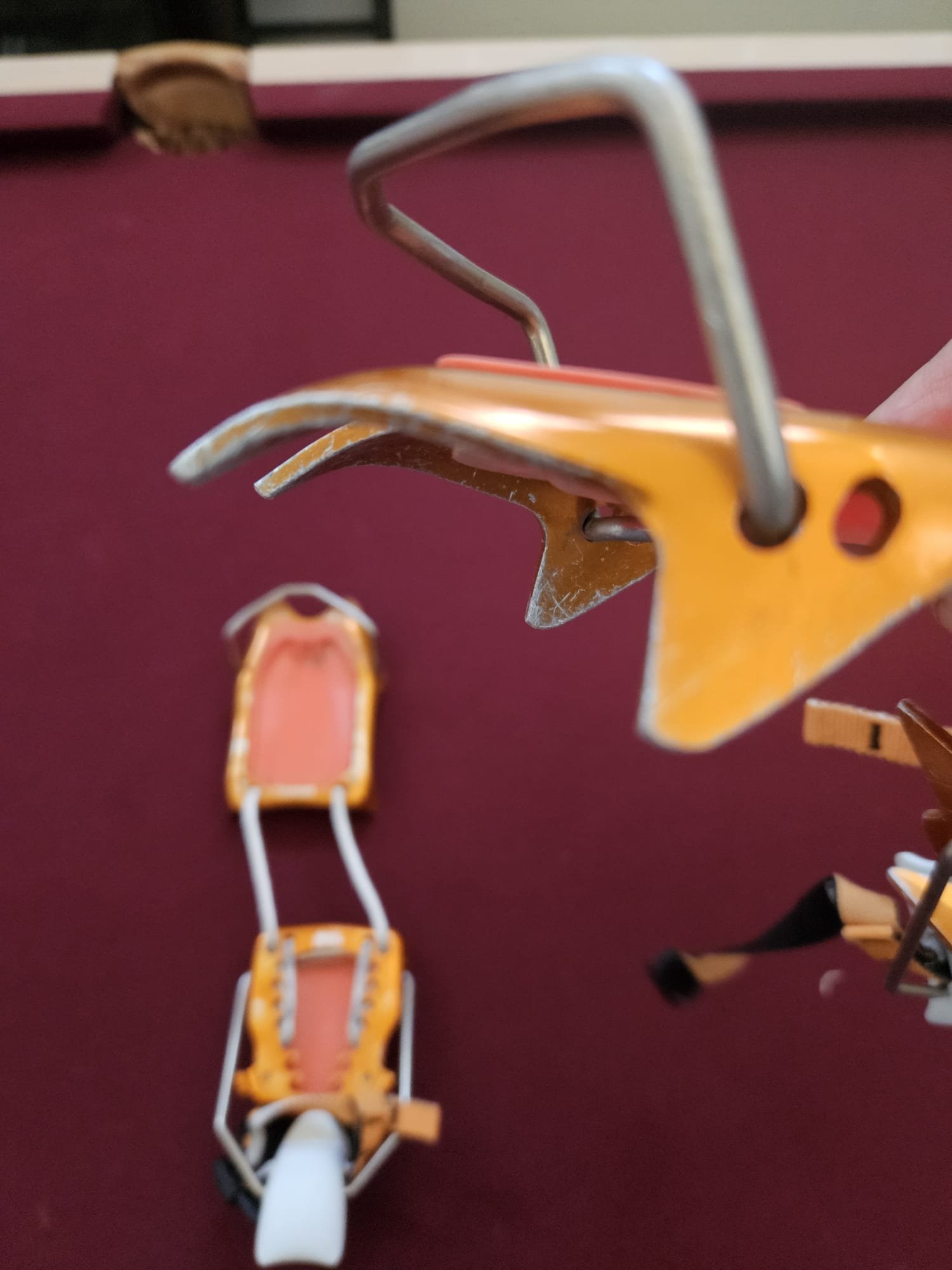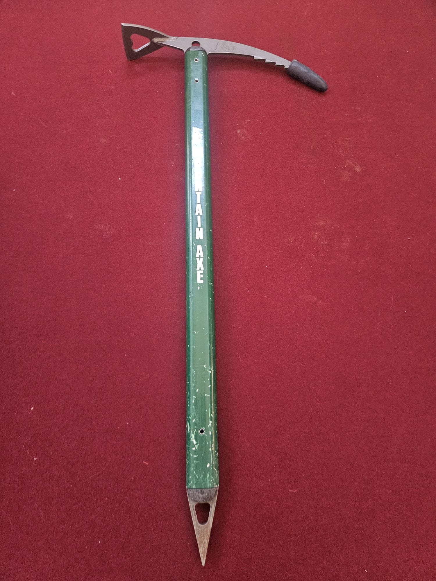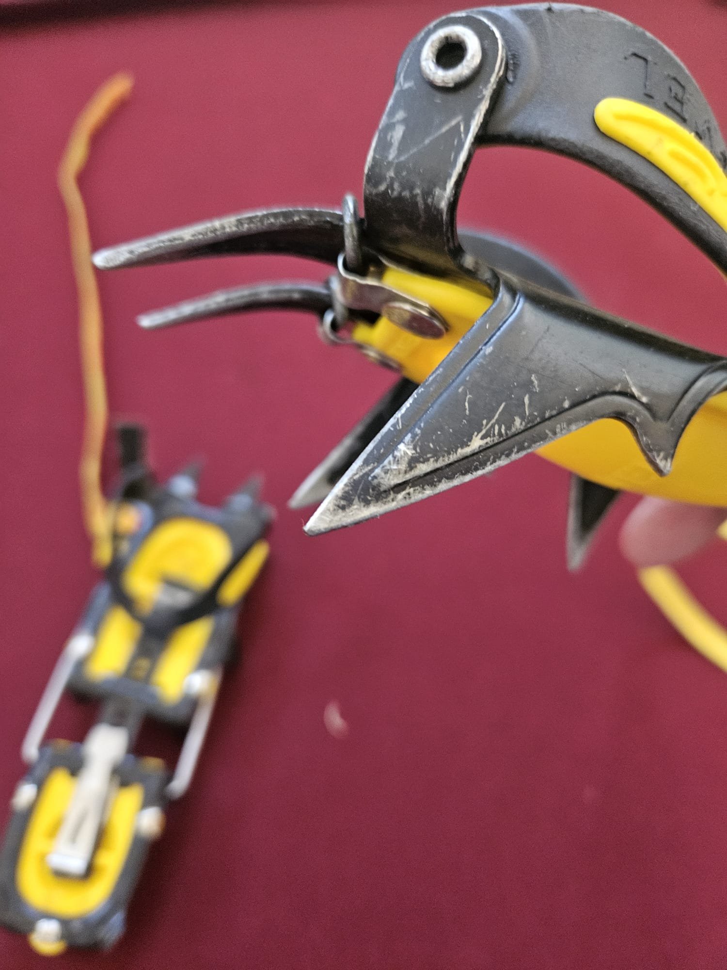 OK, be nice to the old fella. I'm cleaning out the basement, and my ice climbing days are finito. Some of this stuff is definitely antiquated, and may have lost all its cool/useful factor. I can handle that. First the good stuff: Ice screws! 1-20cm BD Express, 2-20cm Grivel 360s, 3-15cm Grivel 360s, 2-12 cm 360s. Teeth are in very good to excellent condition. These are all older style Grivels with a more compact hanger design. They're great for placing in tight spots. Included is an OR tool roll for hauling them around without damaging them or your pack's contents. Asking $300 for the set. Grivel Wing Ice Tools. Back in the day these got the job done, and still would, but....? They've seen some modifications: Originally came as the light alpine model with aluminum spike; I added stainless steel spikes, shaft was drilled, custom adapters and stainless hardware used to install BD quick release leashes. Then I realized leashless was the biz and added a pommel and upper grip. If nothing else, maybe the spare picks are still desirable. In addition to the Evolution picks mounted on the tools, I have 2 NOS Evolutions and 1 NOS Gulotte; unused. And another 3 Evolutions in various states of decripitude. Make me an offer. 'Had enough Grivel yet? How about a set of Rambo crampons! Comes with antibotts. Right now setup as mono's but all the hardware is there to convert back to dual. Points are in good condition, not used for scratching up rock. Comes with a nice Onsite Equipment crampon bag from our friends up north, eh? Let's say $50 OBO. Back to the land of BD. Good general purpose steel crampons; I forget what model they are. $30. 3 handy clippers to attach to your harness and rack all those sweet screws you scored from here. $10 And finally. I have 2- 60cm snow pickets; one an MSR Coyote, one is from SMC. (No pics) They're pretty much equivalent. $15 each OBO. Or, if you're one of those crazy, poor, badass kids who rolls the dice on bail gear, I might just give these to ya. A portion of the proceeds goes to support this fine site!